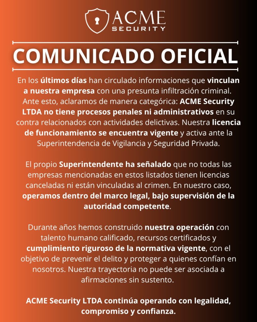 ACME SECURITY LTDA ofrece servicios de Vigilancia y Seguridad bajo las modalidades fija y móvil, con autorización para el uso de armas y medios tecnológicos. También brinda servicios de escolta para personas y mercancías, todo con aprobación de la Superintendencia de Vigilancia y Seguridad Privada. Somos la solución para quienes buscan operar de manera segura y confiable.